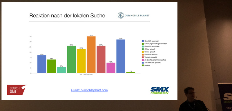 Eine der für mich besten Sessions der SMX von Kai Spriestersbach. Kai hat gezeigt, wie wichtig das Thema Local SEO ist, da mittlerweile jede dritte Suchanfrage lokal stattfindet. Ebenso hat er auf den ROPO-Effekt hingewiesen (research online - purchase offline).