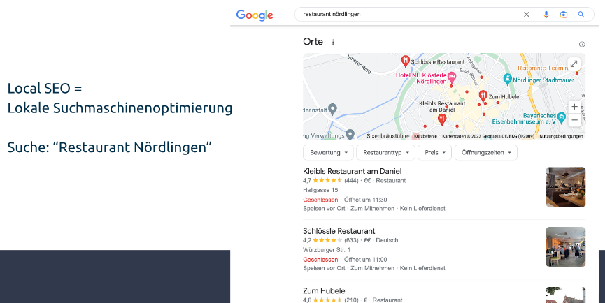 Sie sind als Besucher in der Stadt Nördlingen. Für den Abend suchen Sie ein geeignetes Restaurant und geben deshalb „Restaurant Nördlingen“ in Google ein. Als Ergebnis erhalten Sie eine Reihe an Restaurant-Vorschlägen, mit wichtigen Informationen und Kontaktdaten für Ihre Suchanfrage.